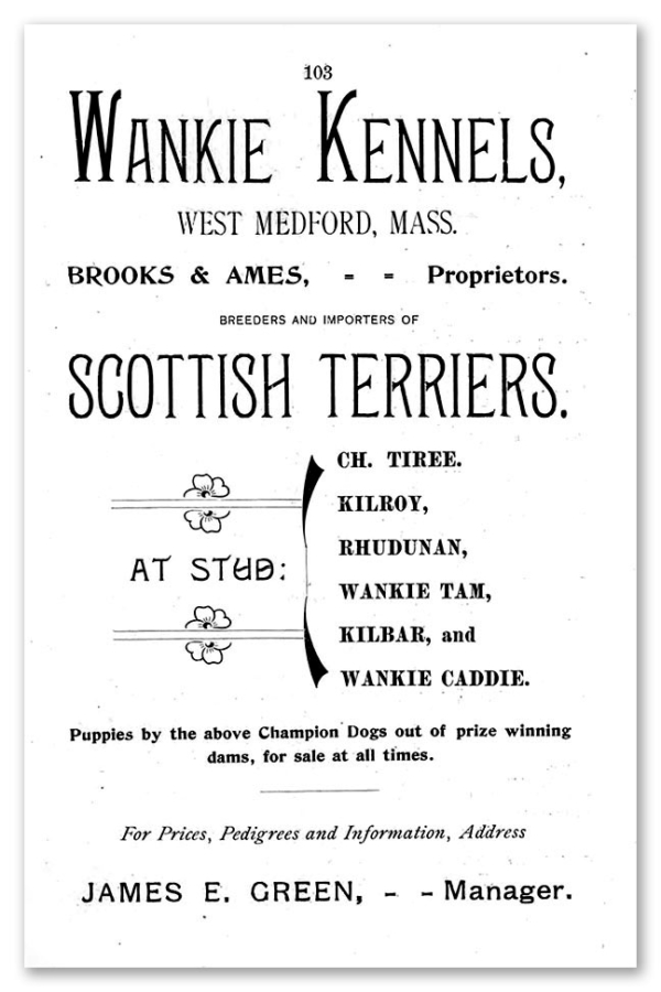 In 1891, Henry Brooks and Oliver Ames took up the reins of bringing Scotties to America with their imports. They formed a partnership in Wankie Kennels and introduced Champion Tiree to the show ring. Although they won ribbons competing against themselves there was still no propagation of the Scottish Terrier in America and they gave up importing and exhibiting.