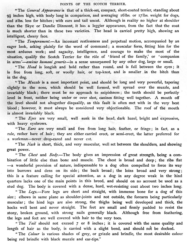 First Breed Standard – POINTS OF THE SCOTCH TERRIER – Book of the Dog – Published 1880 – Author Vero Shaw