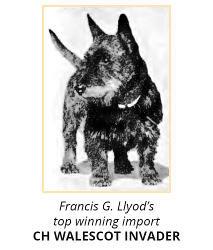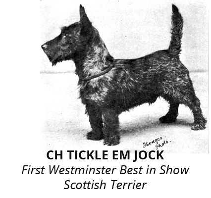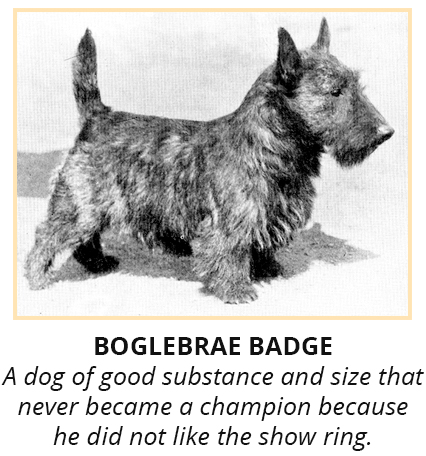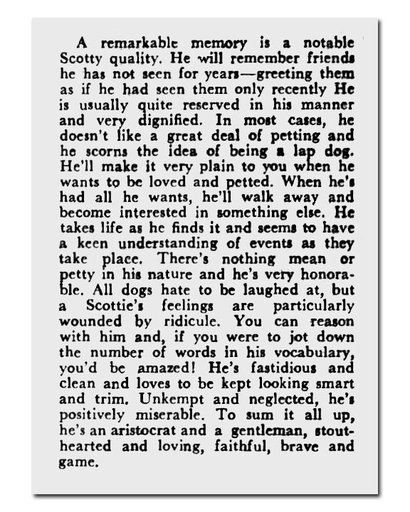 “First of the Superlatively Suitable Six, is that odd little chunk of canniness, merriment, sadness, joy, steadfast devotion, courage and rare powers of discrimination, the Scottish Terrier. The old Highland saying that “guid gear goes in mickle bundles”, might well have been framed specially to fit the Scottie or Diehard, as many of his friends delight to call him. Compact, quick as a cat, alert as only a real terrier can be, he possesses strength far beyond his apparent stature, and a spirit which, once he decides is just, knows no limit. Large of head, short of leg, impressively sturdy in bone and muscle, he is emphatically multum in parvo. And within his wiry coat of black, gray-grizzle, or brindle beats a heart as wholesome and as honest as the wind-swept moorlands from which he comes. Small wonder that those who know him well prefer him to all others.”