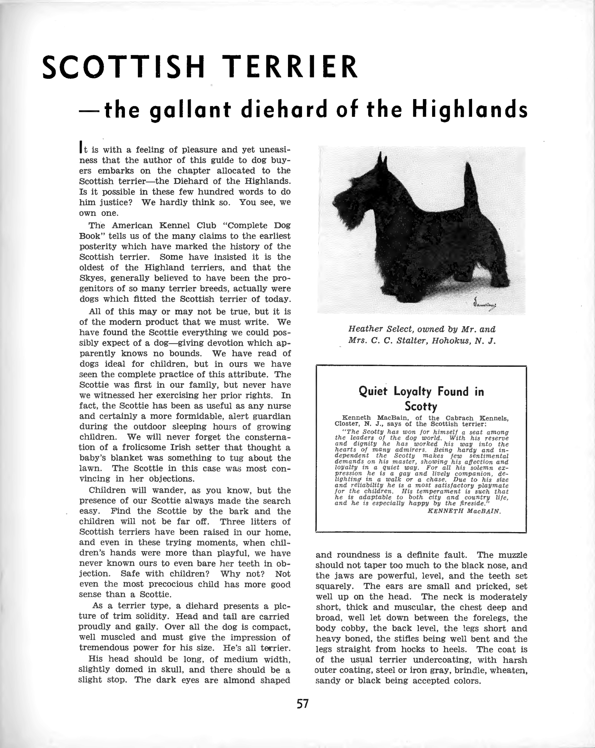 “For it is the new or novice fancier upon whom any breed must depend chiefly for its popularity. The old ones depart or die, although in the particular case of the Scottish Terrier, it is invariably the latter rather than the former event that causes severance of relationship between man and dog. The Diehard holds them till death. Once a Scot owner, always a Scot owner, for no other breed can quite fill his unique place.”