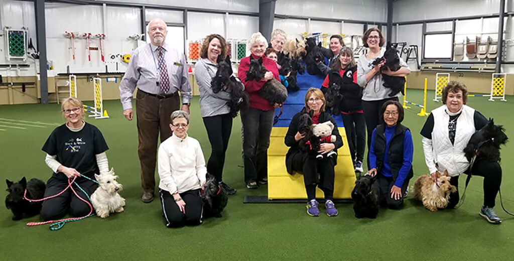 AKC Rally entails walking with your Scottie on a numbered course that has between 10 and 20 stations. Unlike traditional obedience events, the handlers can use multiple verbal commands and/or hand signals to encourage their dogs to complete the tasks designated at each station. This flexibility tends to lend itself to a more relaxed atmosphere and rapport between dog and handler. While some consider Rally to be an easier alternative to competition obedience, others would argue it provides a challenging way for teams to test your scottie’s talents and the teamwork skills between you.