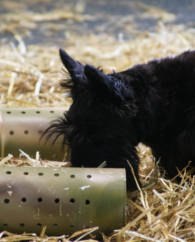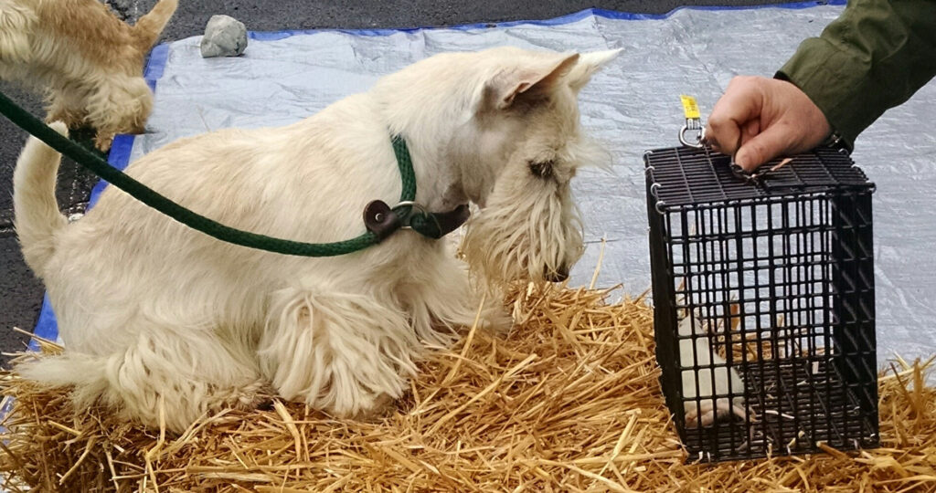 As a dog/handler team, your Scottie finds rats hidden in a maze of straw bales; you call the ‘find’. And yes, rats are always safe in aerated tubes, and never harmed.