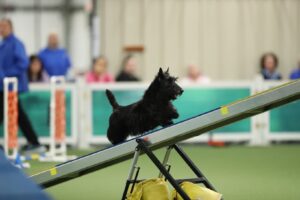The goal of agility is for you and your Scottie to navigate a numbered series of obstacles so that dog and handler run the course without any mistakes and in the shortest period of time. The handler generally is running along with the dog issuing verbal commands or hand signals to communicate which obstacle to do next. As you can imagine, agility is great for building a better relationship with your Scottie!