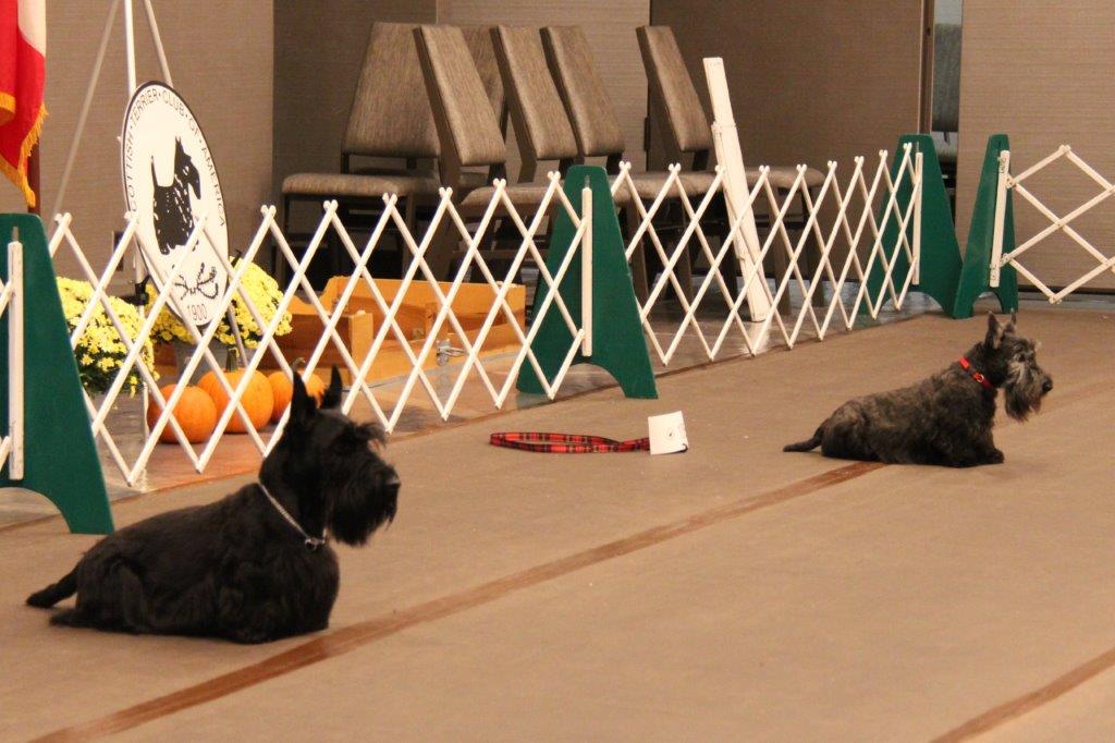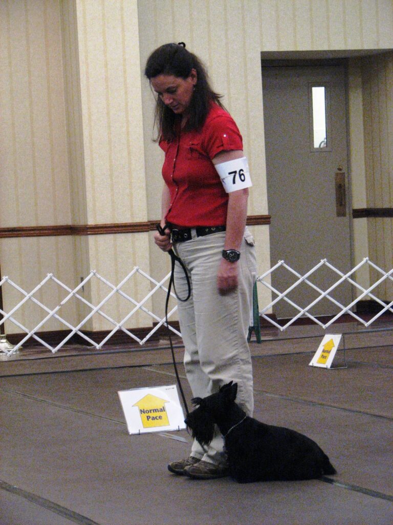 AKC Rally entails walking with your Scottie on a numbered course that has between 10 and 20 stations. Unlike traditional obedience events, the handlers can use multiple verbal commands and/or hand signals to encourage their dogs to complete the tasks designated at each station. This flexibility tends to lend itself to a more relaxed atmosphere and rapport between dog and handler. While some consider Rally to be an easier alternative to competition obedience, others would argue it provides a challenging way for teams to test your scottie’s talents and the teamwork skills between you.