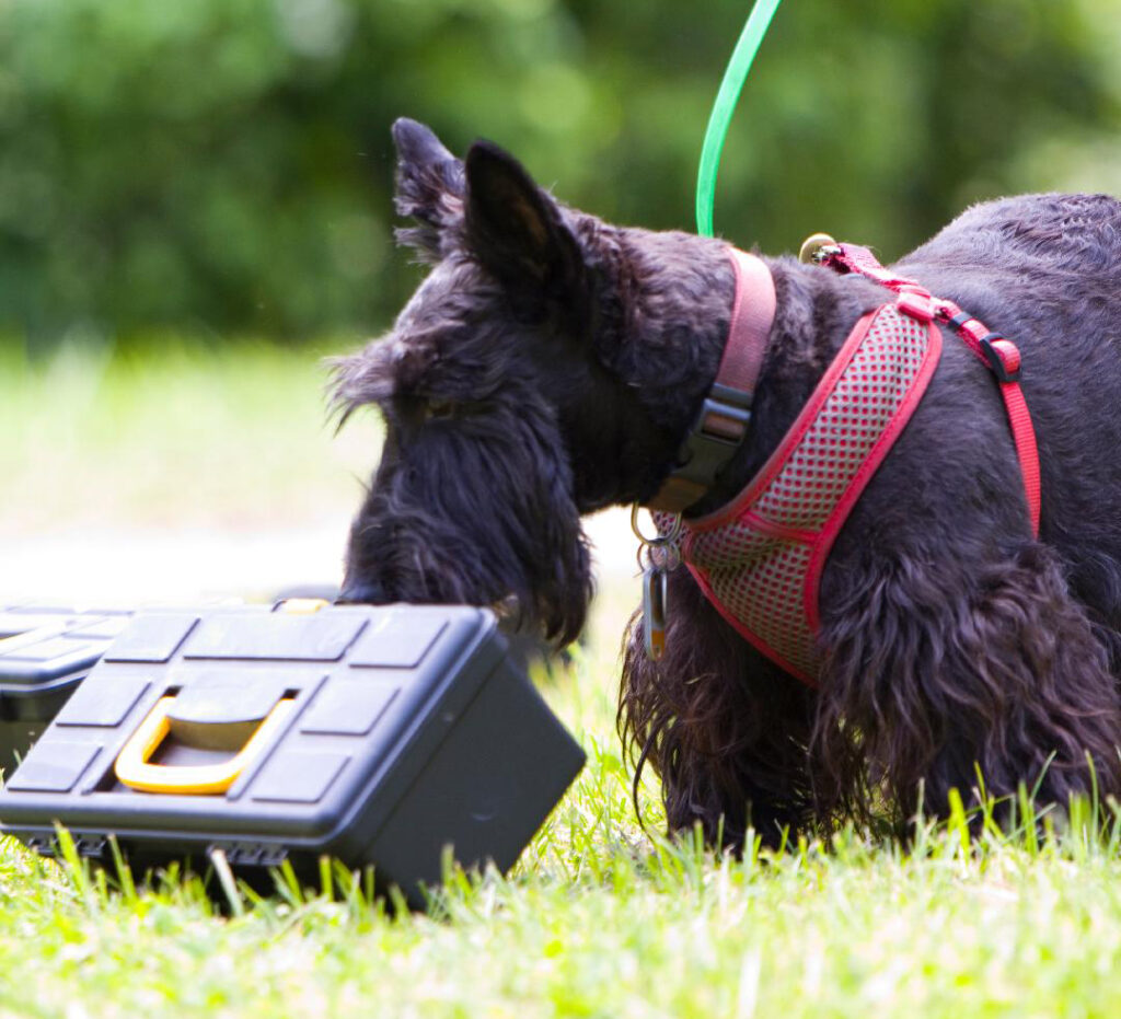 Scent Work is based on the work of professional detection dogs (such as drug dogs and service dogs), who detect a wide variety of scents and substances. In AKC Scent Work, your Scottie searches for cotton swabs scented with essential oils (Birch, Anise, Clove, and Cypress). The cotton swabs are hidden in a pre-determined search area. When he finds the scent, your Scottie will communicate the find to you; you call it out to the judge.